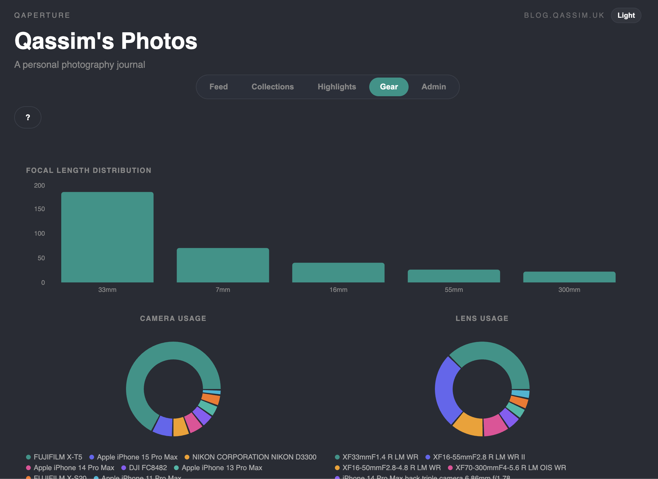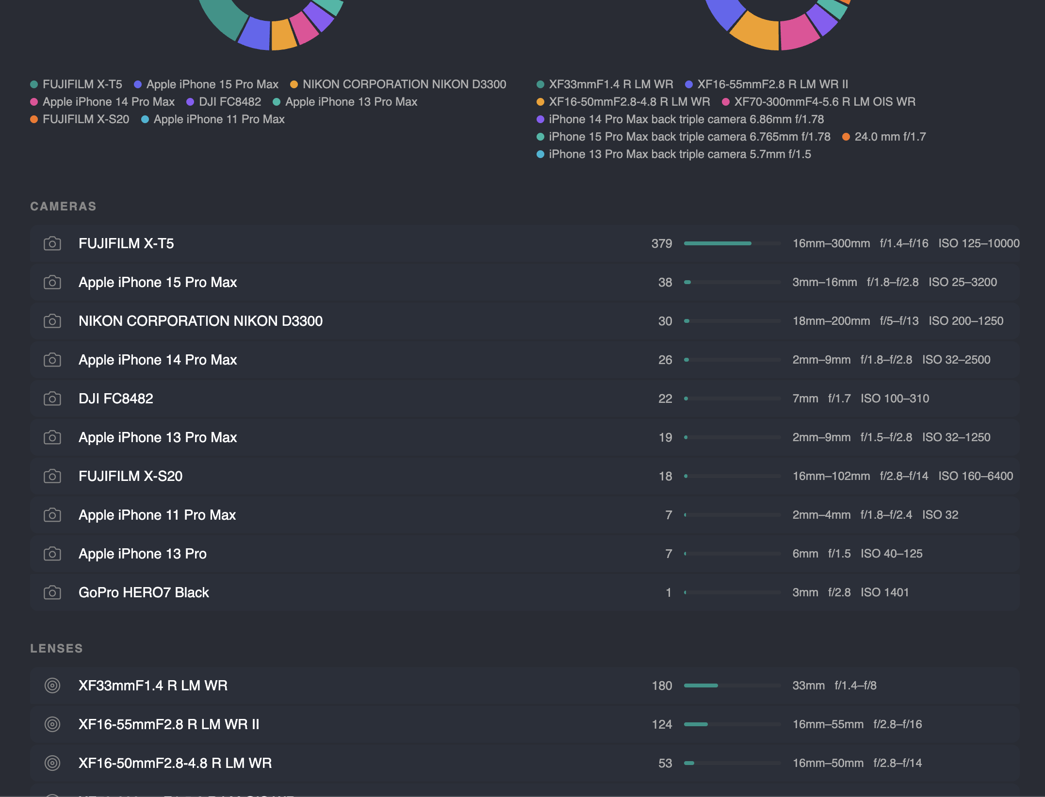 This highlights what are my most used focal lengths, most used lenses, most used cameras and allows you to then go through and see all photos for a given camera: