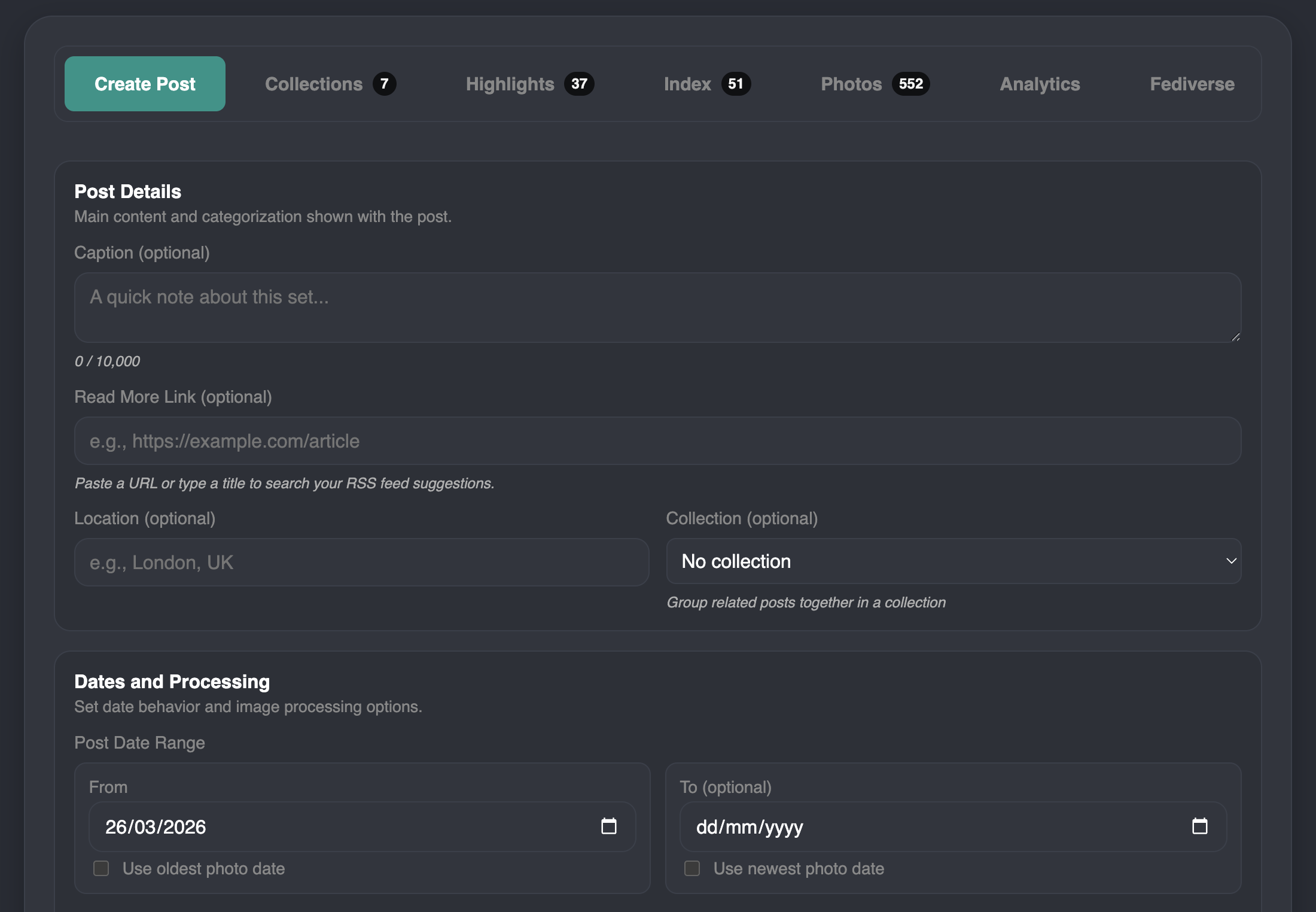 - Posts that support a date range of which the photos were taken