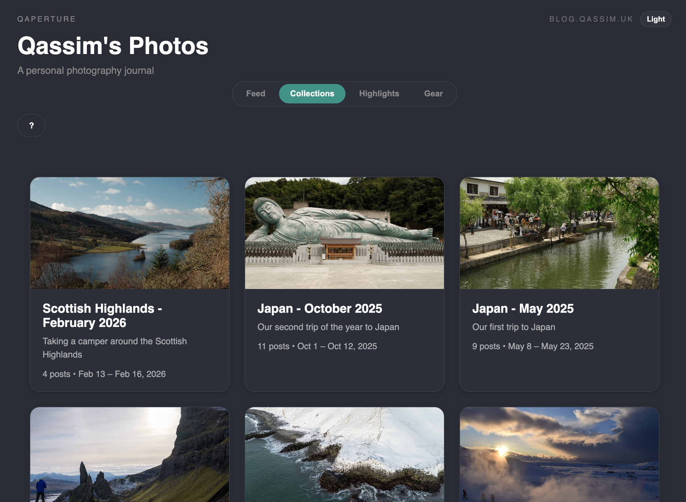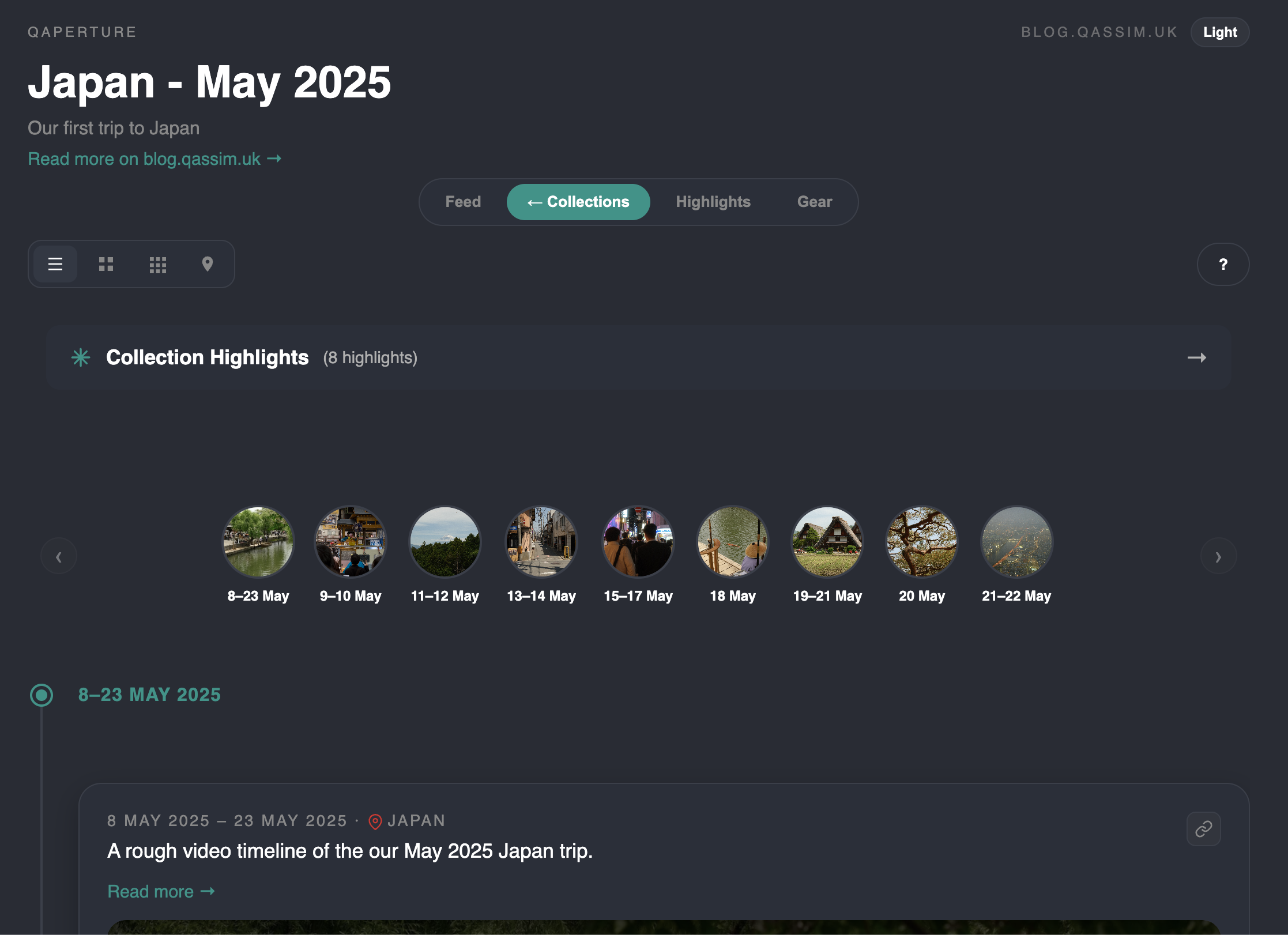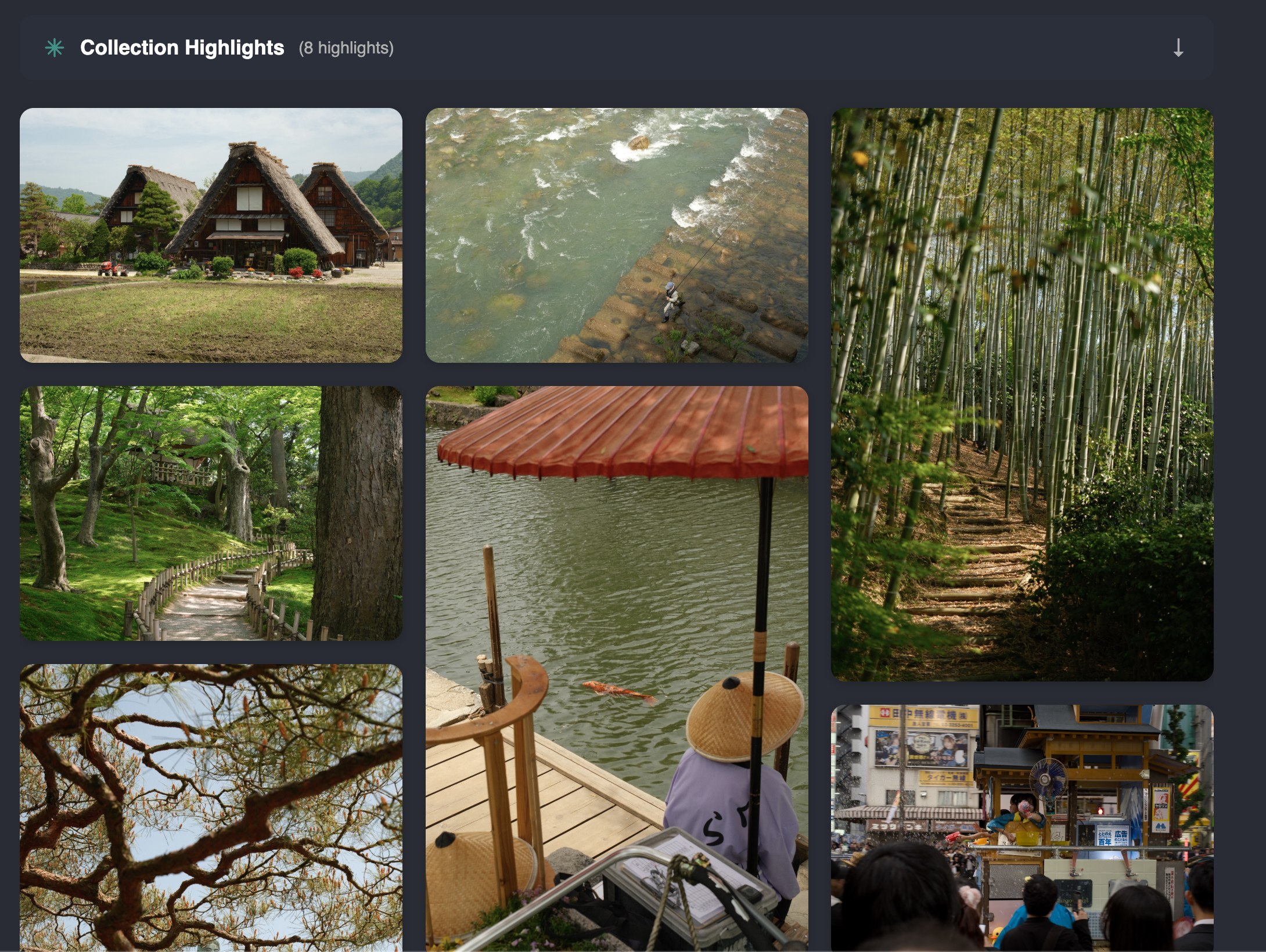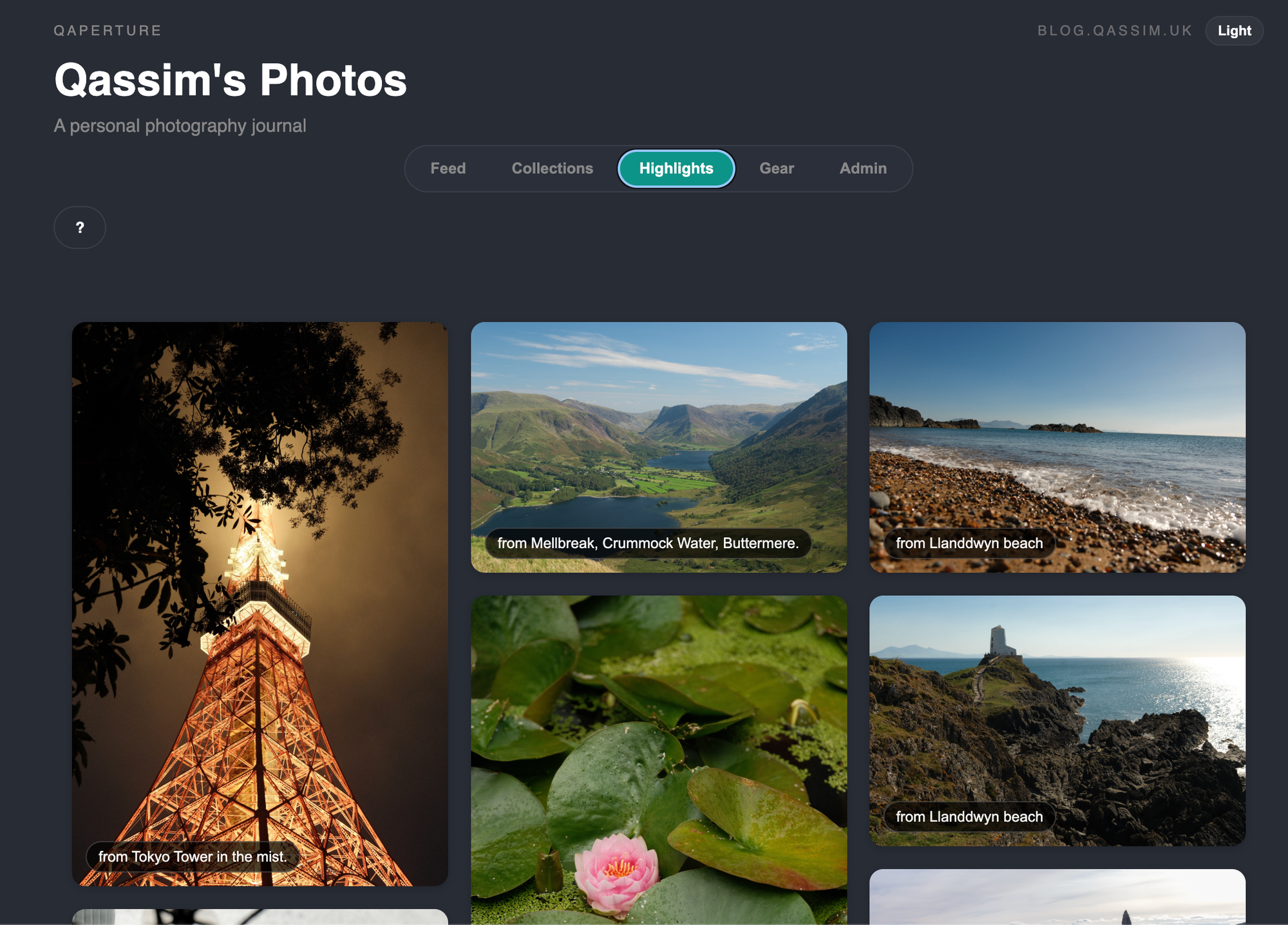 The 'collection highlights' view extracts all photos from all posts in the collection which have been marked as 'highlights' and displays them up here in a masonry layout.