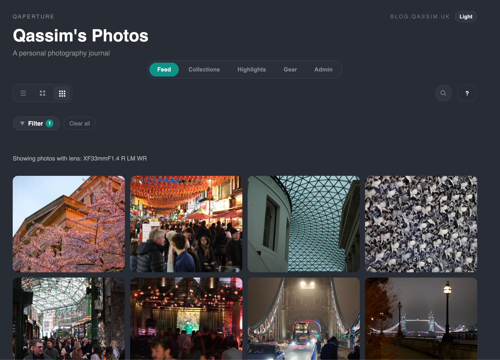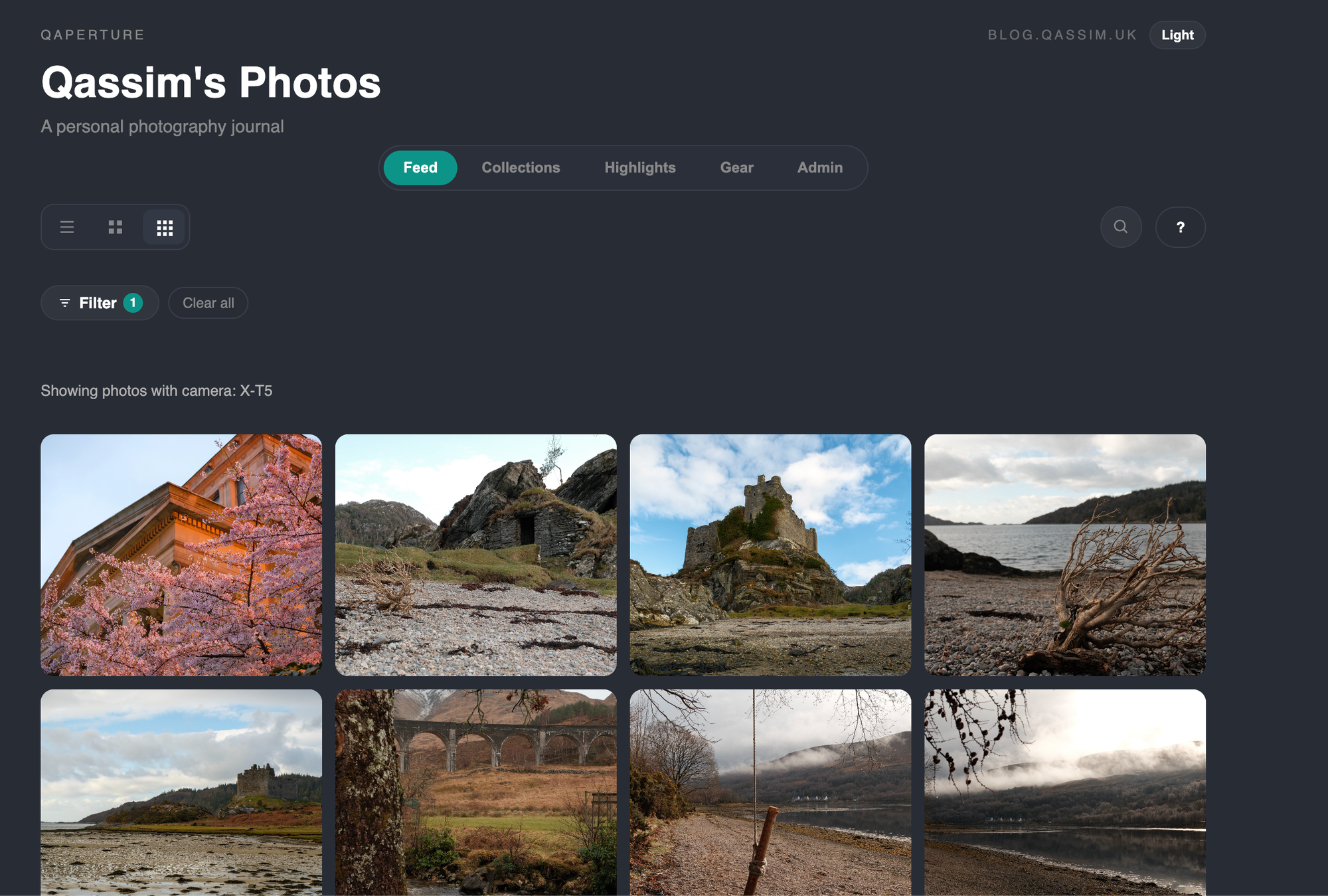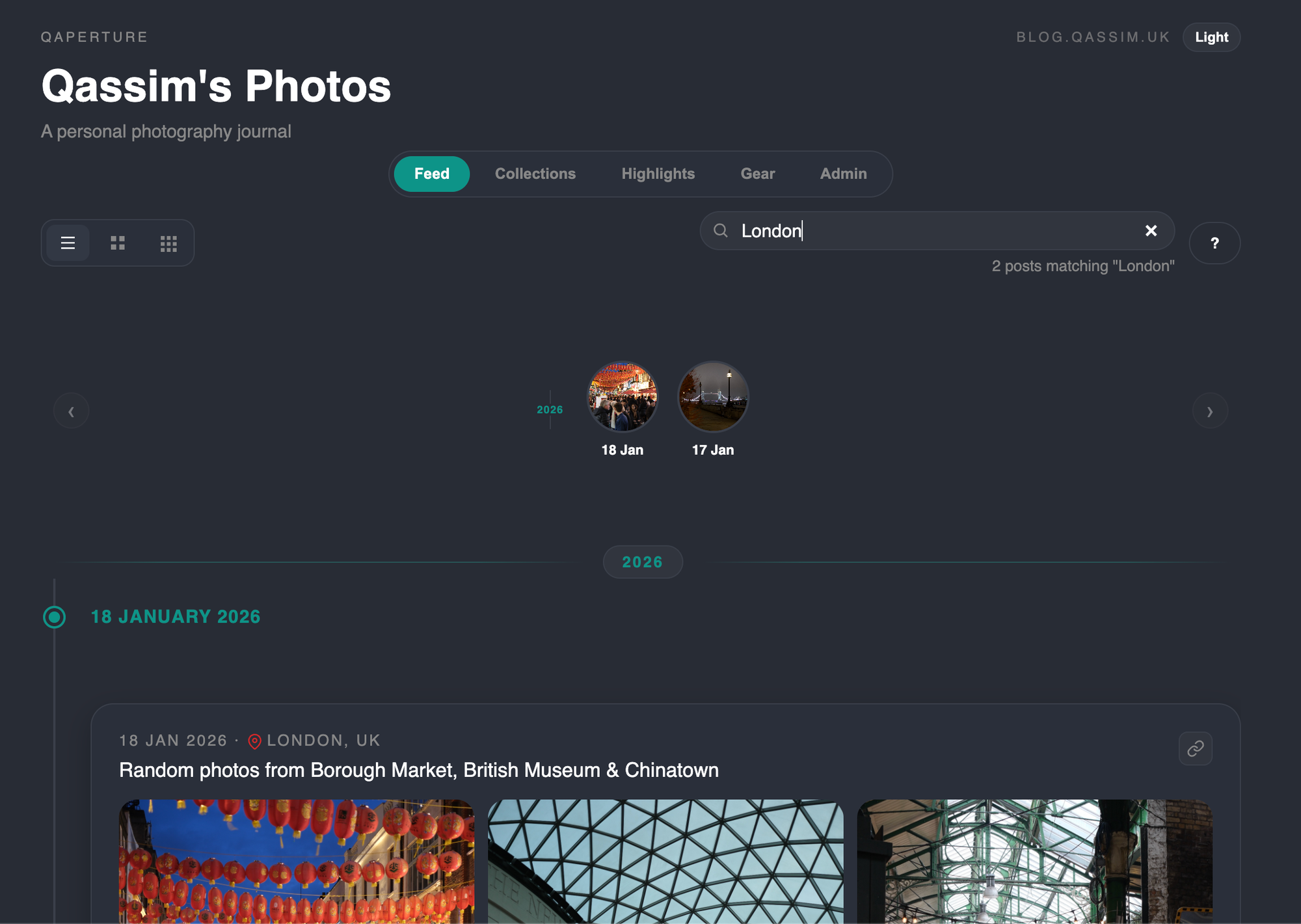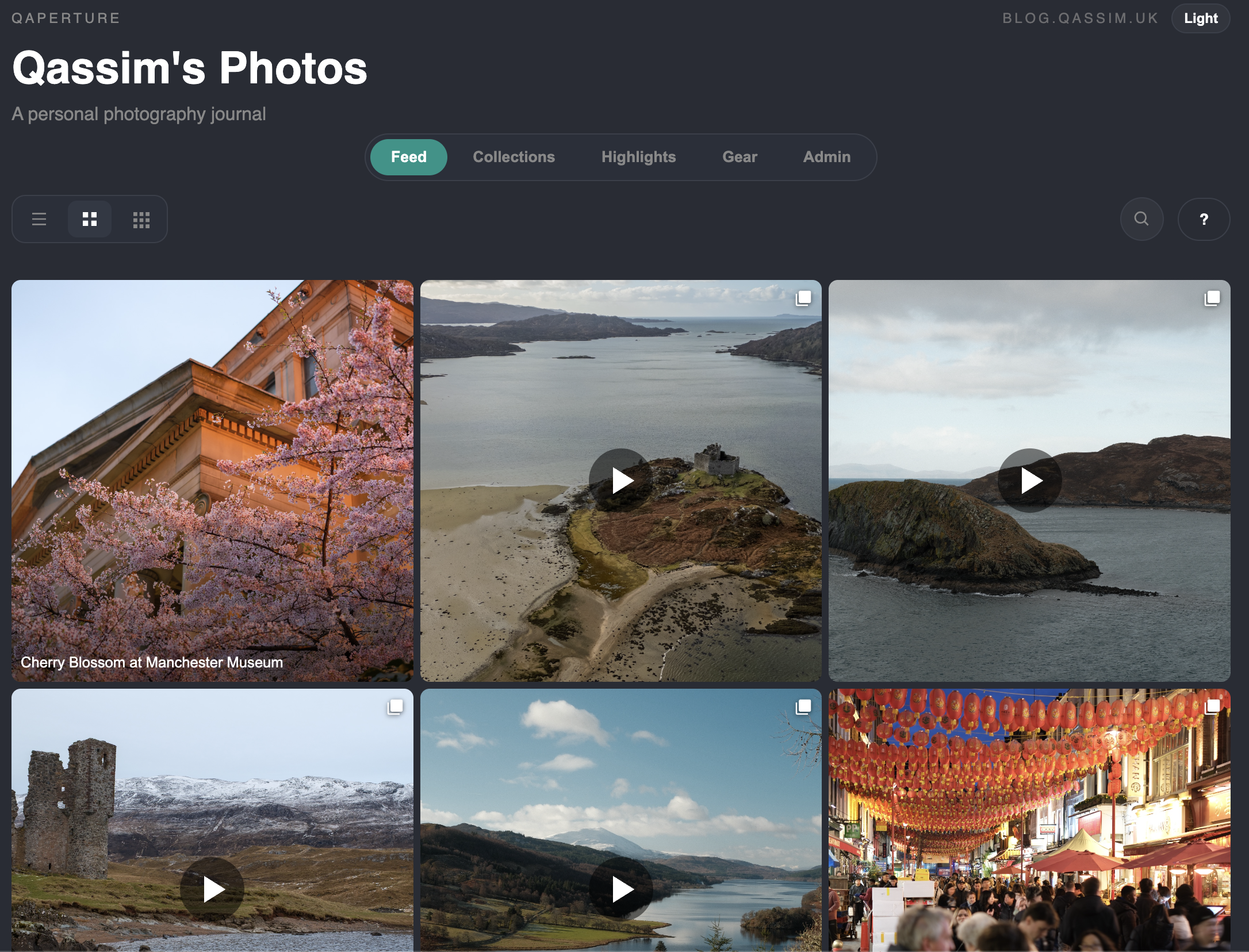 The 'collection highlights' view extracts all photos from all posts in the collection which have been marked as 'highlights' and displays them up here in a masonry layout.