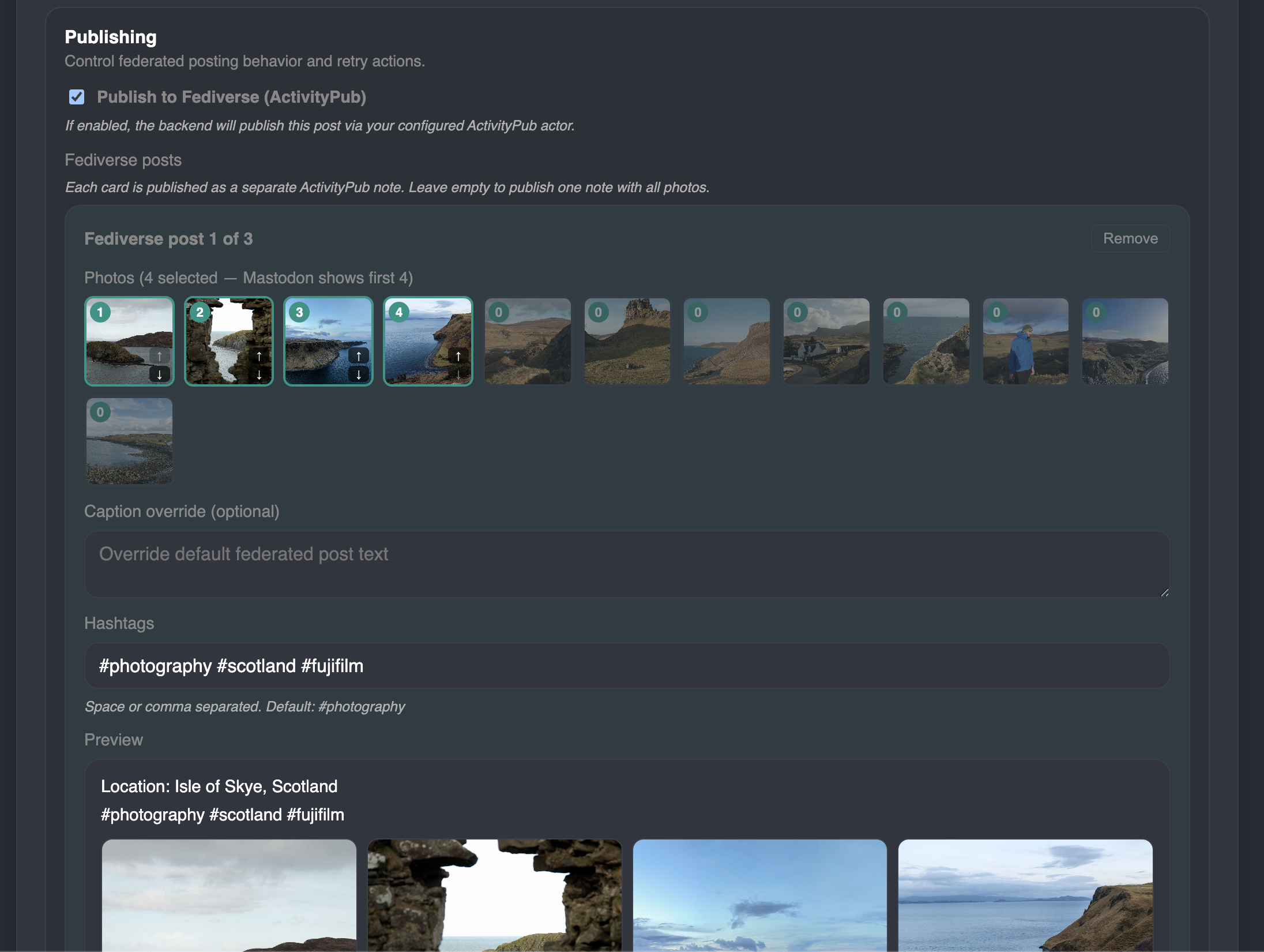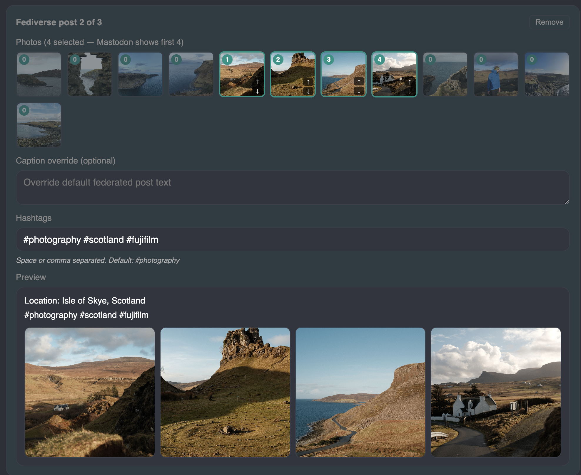 So I added functionality to select 4 images (and order them) to be part of an individual fediverse post.