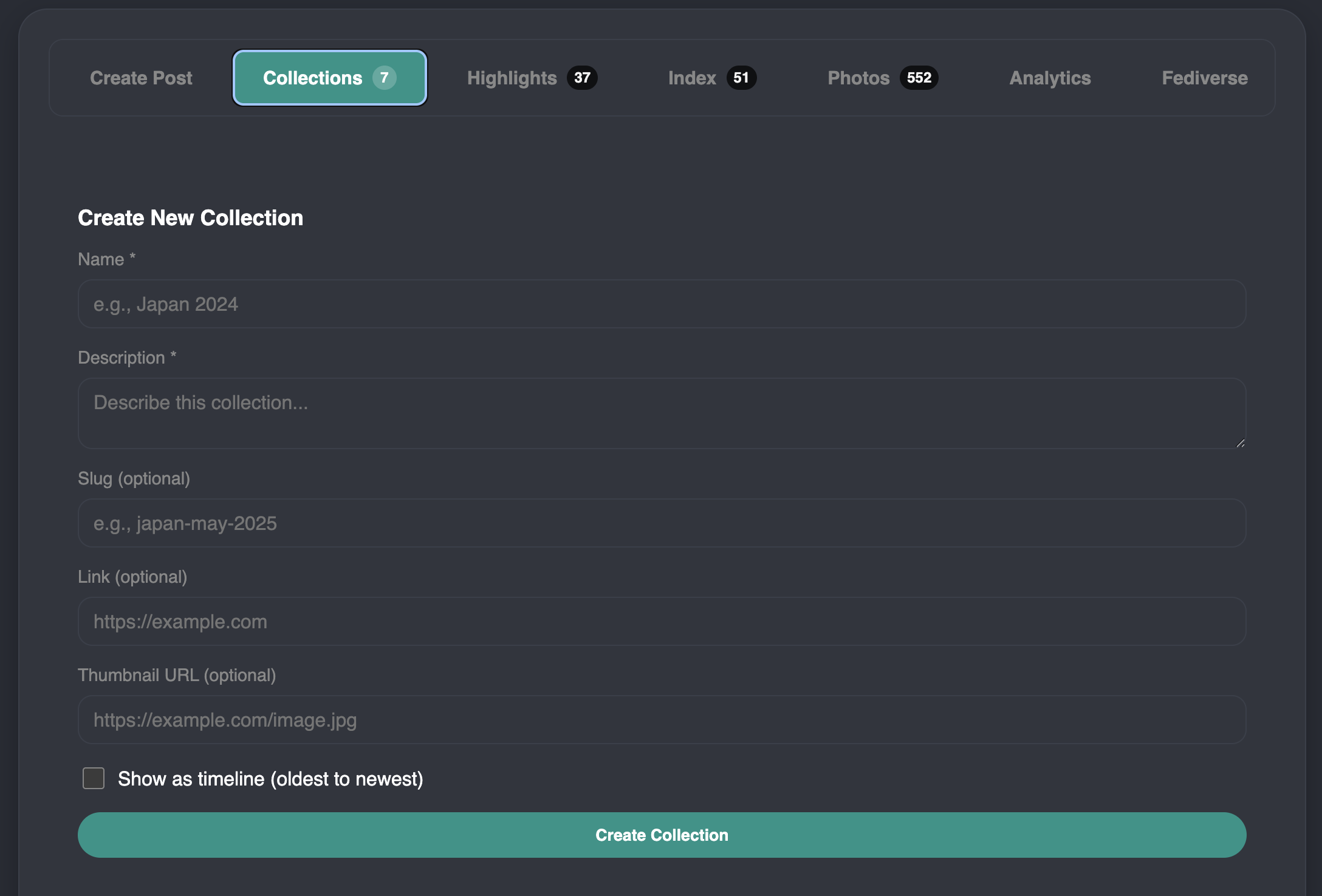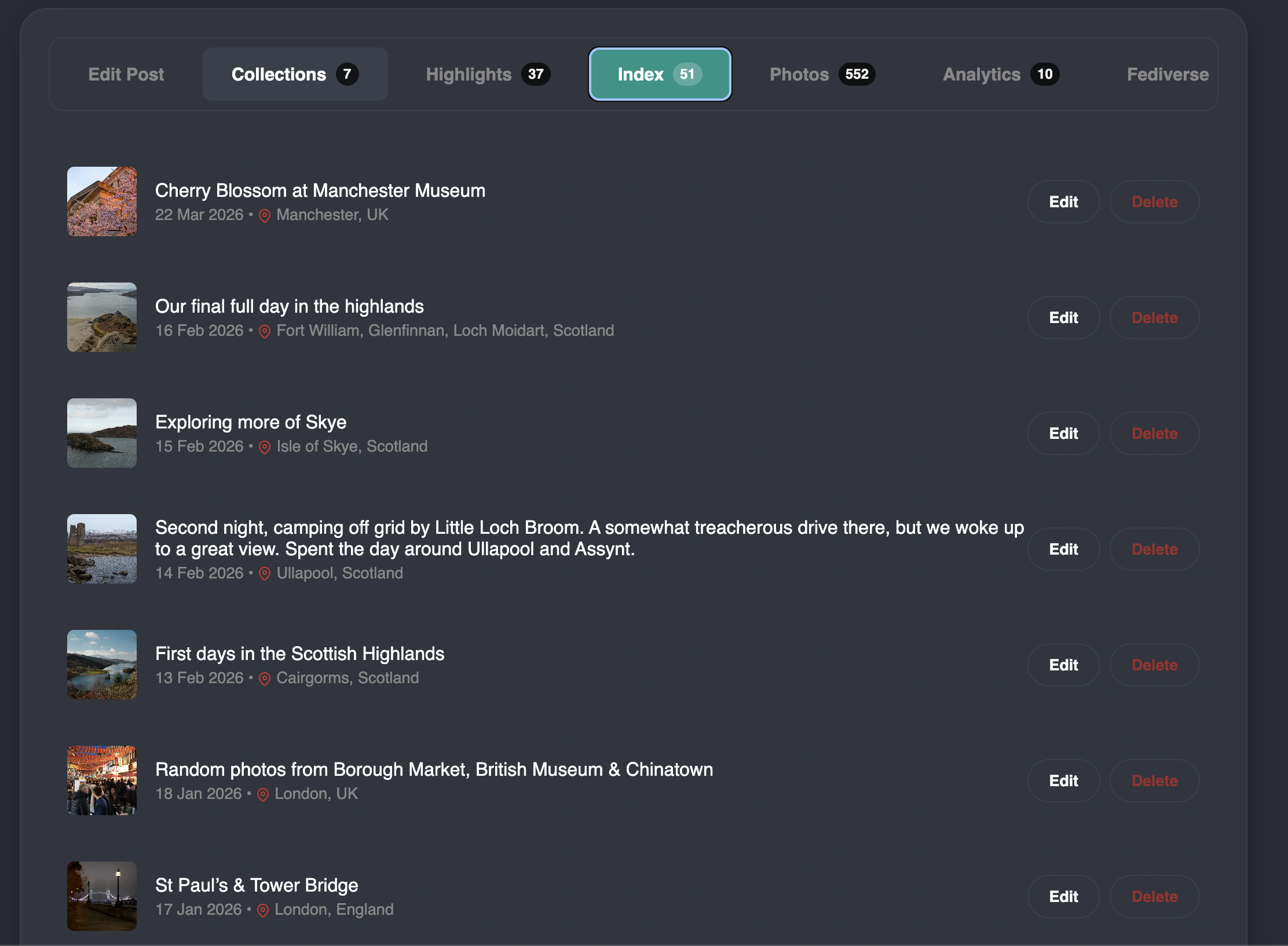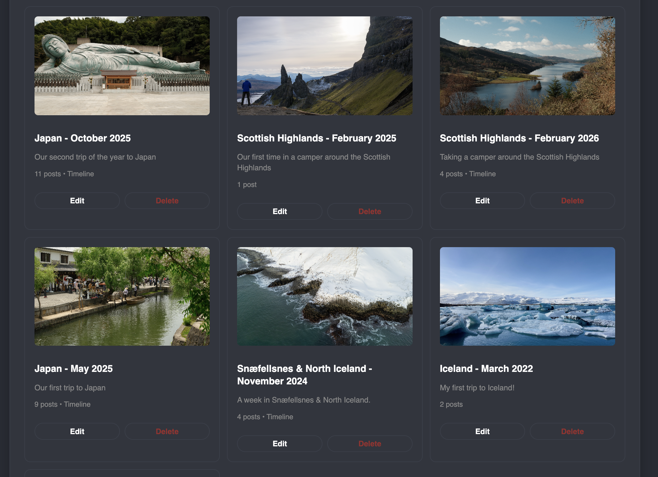 So, similar to how on Instagram, people, myself included, will do story highlights based on a place, or an event, and group all related stories under that - I want the same here. I want to group all posts for a particular trip, for example - under a 'collection'.