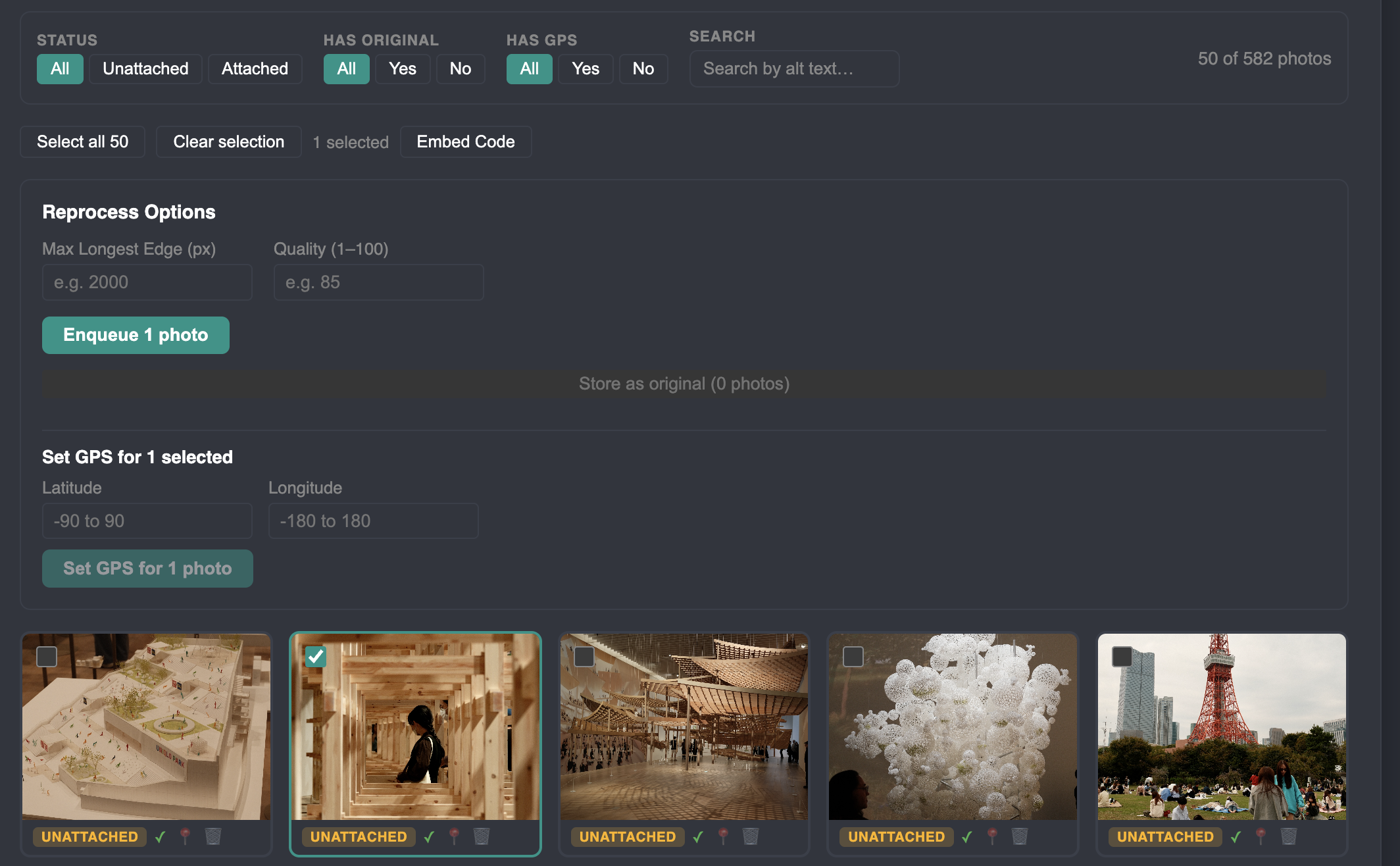 We can also use this view to reprocess a number of photos all at once, with a queue system to ensure I don't overload the server it is running on.