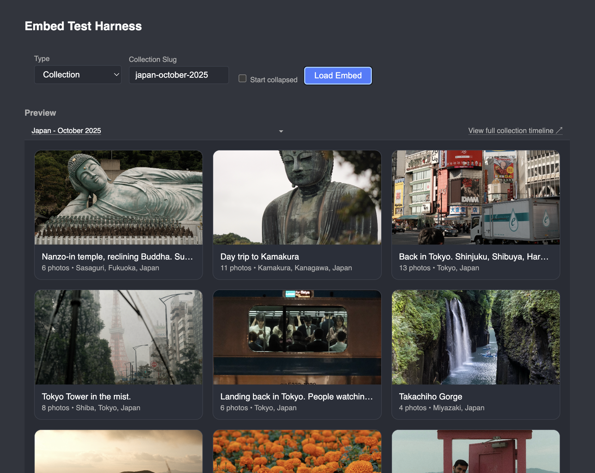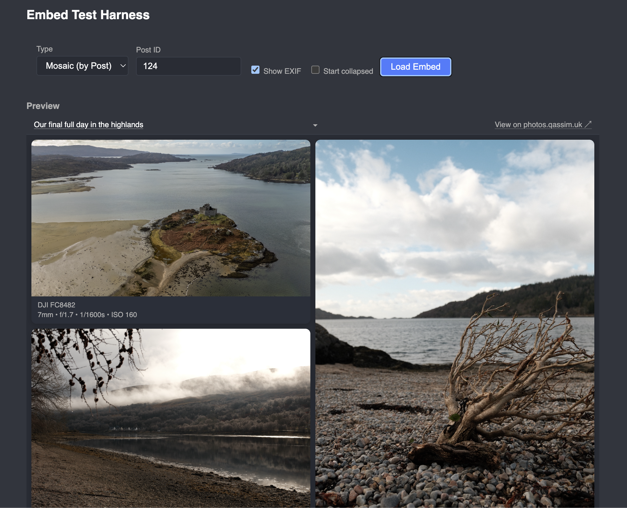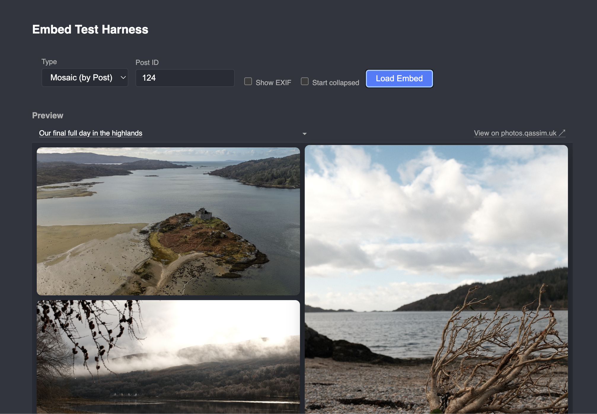 And the lightbox works properly too, can specify different types of layouts, e.g. a masonry layout. Example of the embed test harness: